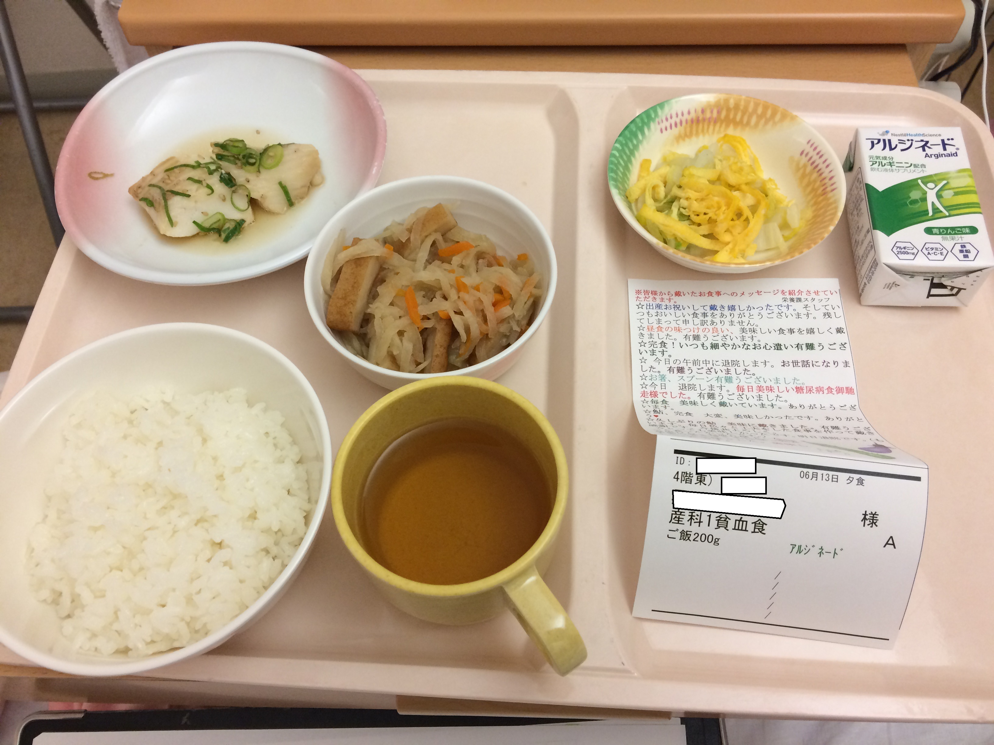 ごはん200g・白菜のおひたし(錦糸卵)・切り干し大根の煮物(にんじん・平天)・煮魚・アルジネード青りんご味