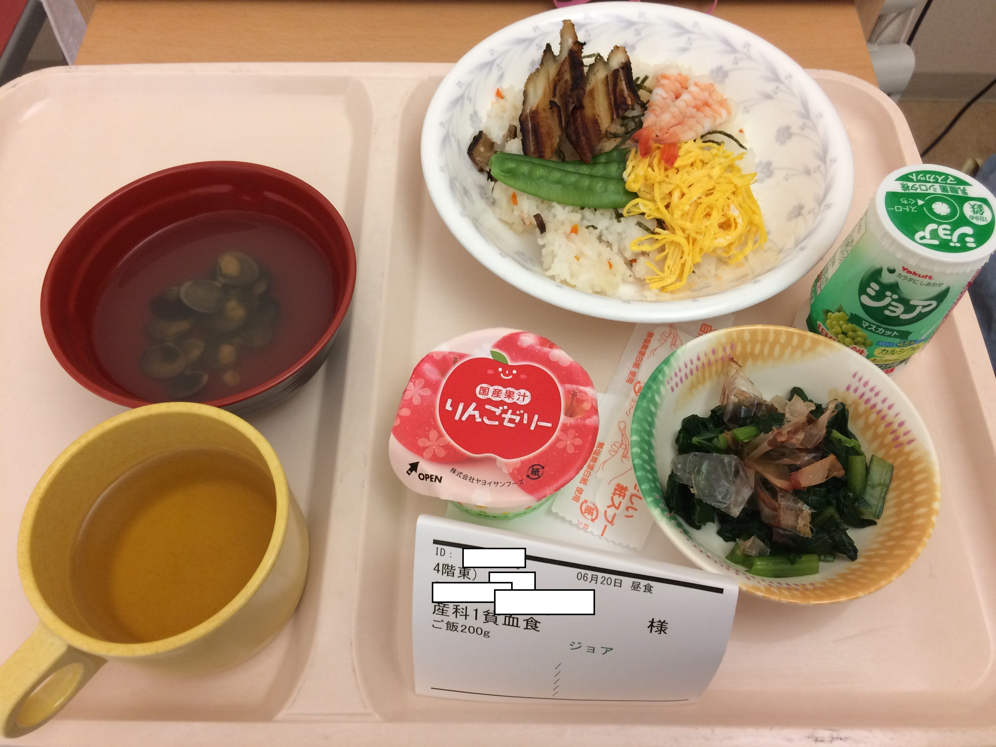 ちらし寿司(ごはん200g・焼穴子・錦糸卵・きぬさや・えび・しいたけ・粉でんぶ・のり)・ほうれん草のおひたし・しじみ汁・りんごゼリー・ジョア