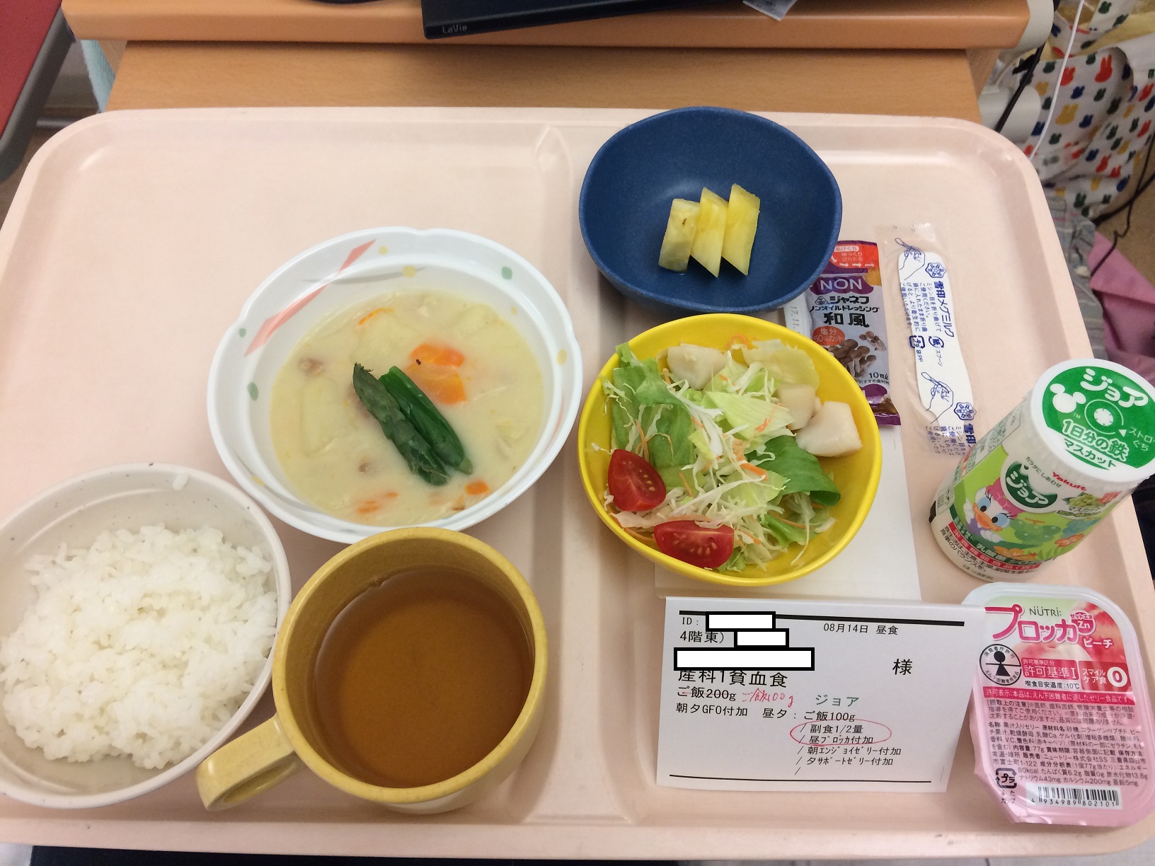 ごはん100g・クリームシチュー(人参・アスパラガス・じゃがいも・玉ねぎ・鶏肉)・サラダ(プチトマト・ほたて・レタス・キャベツ・人参)・パイナップル・プロッカZnピーチ・ジョア
