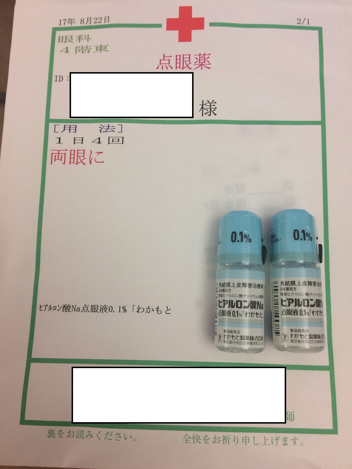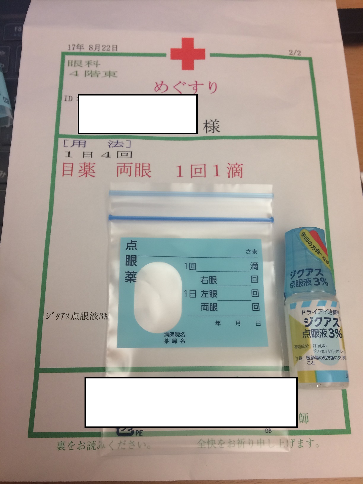 どうやら、ずっと黒目にひっついていた小さ~い白~い点は、ドライアイからきているものらしく、前の「わかもと」と一緒に、新たに「ジグアス」が処方されました。