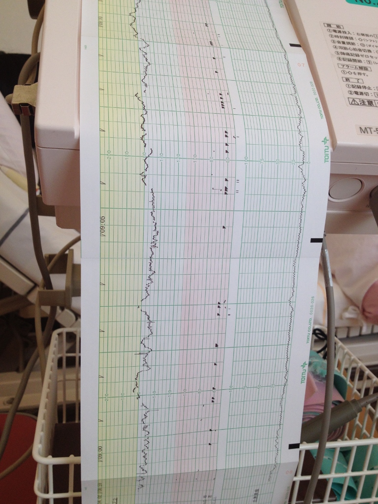 NSTを付ける前、経膣エコーに呼ばれ、経腹エコーはお昼からお呼びします^^との事で、頸管長を測定。一番長くて2.2センチ、お腹が張った状態で1.2センチでした。